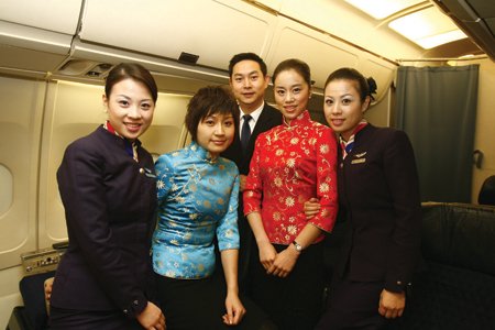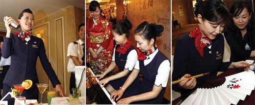 除了专业的技能,这些被挑中的成员也个个“身怀绝技”,“有会茶艺的,会唱戏的,会插花的,还有专门到酒店经过烹饪培训的,世博会期间,组员们都会在航班上为旅客们表演这些拿手绝活。到了明年5月,我们还将增加人数,更好地为世博服务。”
