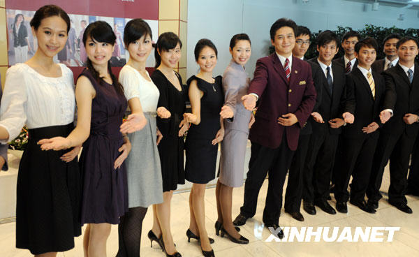 3月14日,由空中服务培训师进行特训的上海世博会台湾馆16名亲善大使,在“中华航空”松山航训区空训馆进行成果验收。