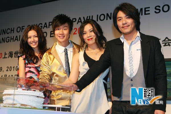 4月19日,新加坡歌手孙燕姿、林俊杰、蔡健雅、阿杜(从左至右)共同出席上海世博会新加坡馆主题曲《感动每一刻》音乐电视的首发新闻发布会。新华社发(朱良城 摄)
