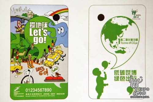 记者在现场看到,这张低碳交通卡只有普通交通卡的一半大小,印刷精美,像一个小小的纪念卡片,卡的正面是一个非常可爱的卡通图案,描述绿色出行的方式,还写着“爱地球,let’s go!”。背面的底色是白色,图案由绿色构成,上面写着:“一吨二氧化碳当量,低碳世博,绿色出行”。