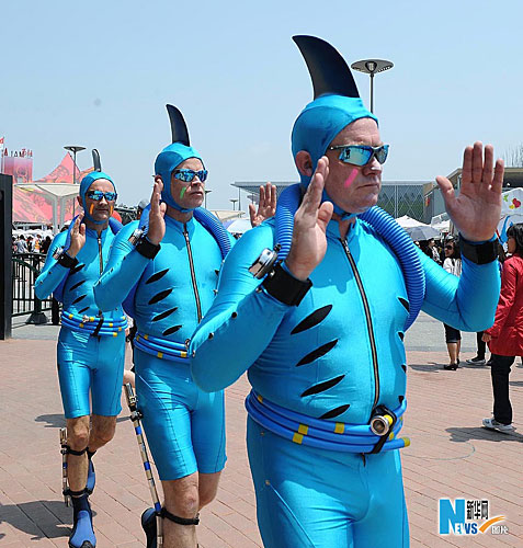 5月1日,几位工作人员扮成鲨鱼在上海世博园澳大利亚馆附近的观众中“游弋”。当日,上海世博园正式开园