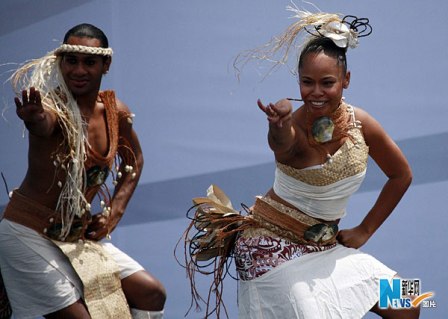 5月1日,演员在世博园大洋洲广场表演太平洋现代舞。太平洋现代舞热情洋溢,吸引不少观众驻足。当日,上海世博园正式开园