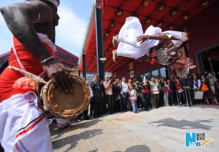 5月1日,上海世博园正式开园,首批持票参观者接踵而至。这是斯里兰卡馆门口的舞蹈表演吸引众多参观者驻足观看