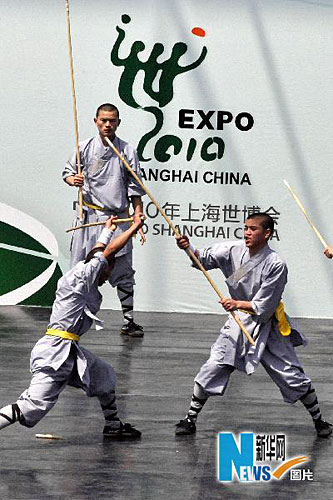 5月1日,少林武僧表演棍术。当日,上海世博园正式开园。来自河南嵩山少林寺的武僧在世博园内为游客展示少林功夫