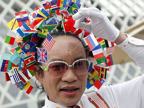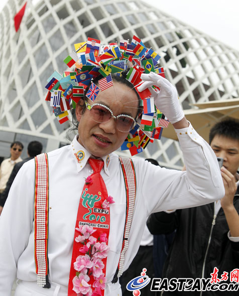 精彩纷呈的世博会,吸引了八方游客前来观展。穿梭在展馆之间的行为艺术表演,也是观众不容错过的节目。更有观众自发上阵,支持世博,堪称一绝。图为有广西人奇人之称的韦盛初,头上插满世博旗帜的银针,支持世博。(记者 刘歆/摄)