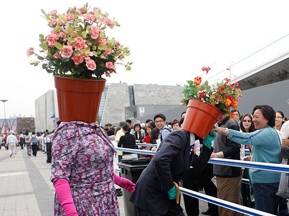 精彩纷呈的世博会,吸引了八方游客前来观展。穿梭在展馆之间的行为艺术表演,也是观众不容错过的节目。更有观众自发上阵,支持世博,堪称一绝。图为在德国馆前,行为艺术表演者吸引众多观众驻足观赏。(记者 刘歆/摄)