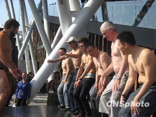 5月24日,上海世博会新西兰馆门前十分热闹,十多名新西兰演员在世博会场舞台上,表演他们颇具特色的民俗舞蹈,吸引了众多游客的目光,观众们纷纷参与互动,现场气氛十分热烈。