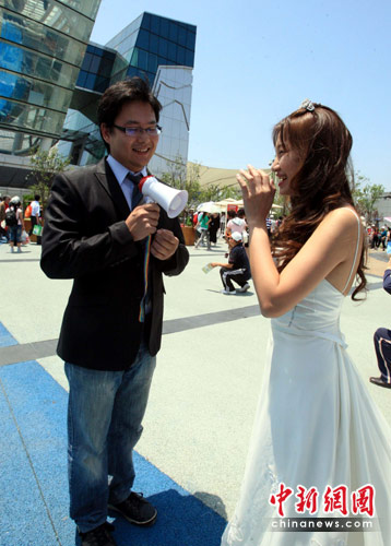 5月30日,台湾有情郎陈毓成在上海世博会台湾馆前用小喇叭向女友钟佳均深情求婚。据了解该对情侣是专门前来上海参观世博会的。中新社发 潘索菲 摄