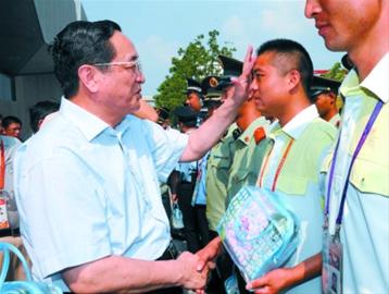 烈日下,俞正声为世博园区服务保障人员拭去额头的汗水。周寅杰 现场图片