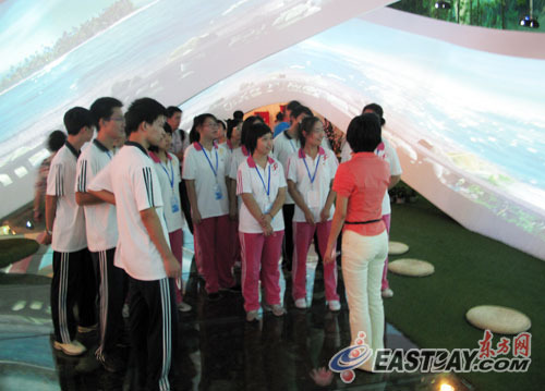 东方网记者乔礼9月10日报道:“同学们,谁能告诉老师,这里的石块哪一部分是生物化石,哪一部分又是矿物石呢?”这并不是一堂普通的地理课,而是来自上海市回民中学的15位高二学生今天上午在中国馆(网上中国馆)省区市馆内的湖南馆(网上湖南馆),上的一堂生动的“世博一课”。美术肖老师将生物、物理、历史等学科知识都贯穿于其中,为同学们带来了一堂名副其实的“综合课”。