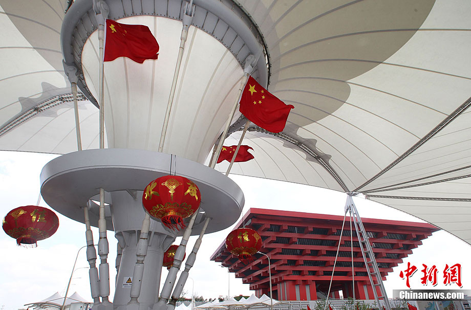 9月30日,世博会中国馆外国旗飘扬,上海世博会中国国家馆日活动将于10月1日举行。中新社记者 任晨鸣 摄