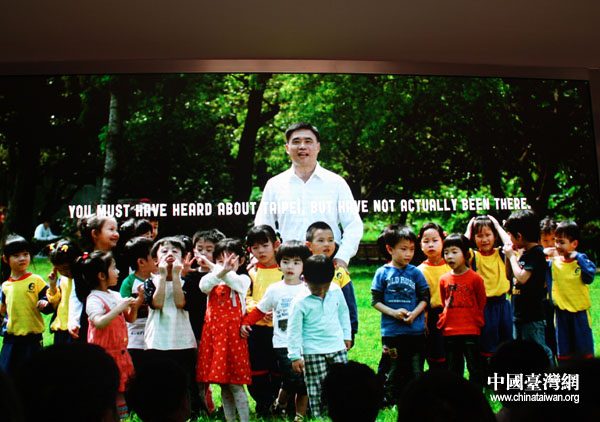 台北市长郝龙斌也和小朋友们一起,通过宣传片欢迎人们来到台北馆。(中国台湾网 张弛 摄)