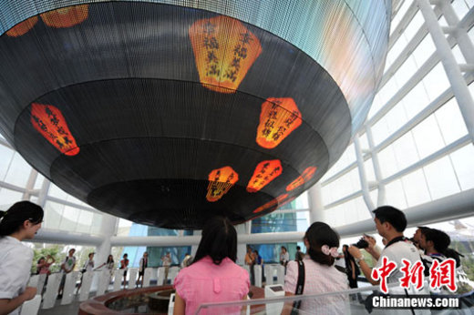 站在用台湾日月潭的水,花莲玫瑰石布置而成的点灯水台前,点击LED灯上的祈福祝语后随着天灯冉冉升起,寓意着在上海世博会台湾馆许下的心愿会飘向全世界并实现心愿,成为游客参观台湾馆行程中最重要的一环。图为游客纷纷在点灯水台前许愿祈福。 中新社发 刘柱 摄