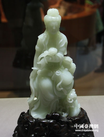震旦馆展示的观音玉雕。(中国台湾网 张弛 摄)