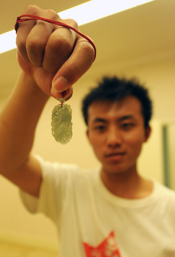 7月13日,周炳鑫展示他从小佩戴在身上的玉。新华社记者 燕雁 摄