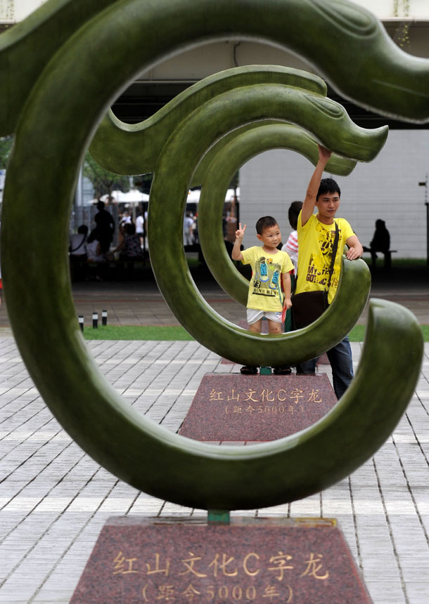 7月13日,游客在震旦馆的红山文化C字龙雕塑前留影。新华社记者 燕雁 摄
