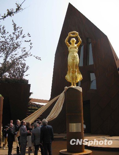 4月28日,经过9755公里的长途跋涉,卢森堡国家艺术瑰宝“金色少女像”在上海世博园区揭开面纱。卢森堡的“金色少女像”是上海世博园内继丹麦“小美人鱼雕像”之后的又一位来自欧洲的国宝级贵宾。 中新社发 陈婷婷 摄