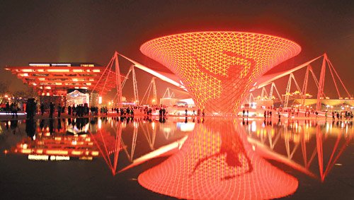 上海世博会“一轴四馆”将被永久保留,霓虹灿烂的中国馆和世博文化中心,夜晚分外迷人。