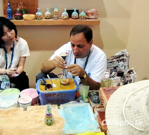 2010年5月27日,在上海世博会约旦馆里,每天都有约旦手工艺人现场表演用彩沙在瓶中作画,描绘沙漠风光等约旦特色景观,每个沙画瓶标价为人民币100元。据了解,这里所有的沙子都是由来自死海海底的的彩矿石磨制而成,从约旦空运到上海的。 中新社发 井韦 摄
