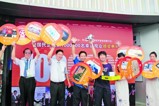 11日11时,来自浙江宁波的幸运观众陈新华成为中国民企馆的第100万位参观者,民企馆共16家参展企业中有15家备足厚礼,陈先生一只手都拿不下,最后儿子赶紧上台解围:帮忙接过奖品。这些奖品总价值约16万元。与此同时,在场的其他400位观众也获赠一份礼物。