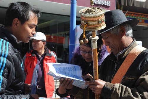 4月3日,拉萨各旅游企业烦人工作人员向市民赠送旅游地图并做相关讲解。(图片来源:中国西藏新闻网 史雁超 摄)