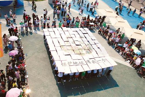 昨天(5日)是世界环境日,上海世博会唯一参展的国际非政府自然保护组织——世界自然基金会(WWF)昨天迎来荣誉日。在世博园大洋洲广场,100名来自华东师范大学的志愿者运用手中的图板集体合作拼出了大熊猫的形象,并向现场观众发出“保护地球,有我一个”的号召,以此来向所有世博观众传递信息:地球是我们赖以生存的家园,可是地球的自然资源并不是取之不尽、用之不竭的。