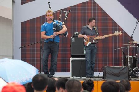 昨天下午欧洲广场的演出中,斯凯里沃尔乐队并没有身着传统的苏格兰短裙,而是穿着帆布鞋、牛仔裤,戴着墨镜,抱着苏格兰风笛和摇滚吉他出场,因为此时他们的传统服装还被落在英国。这次演出并非一帆风顺,出发前一场风暴袭击英国,乐队没能赶上预定的飞机。