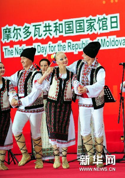 9月12日,世博会迎来摩尔多瓦国家馆日。 来自摩尔多瓦的演员在国家馆日活动上表演民族舞蹈。新华社记者 李百顺 摄