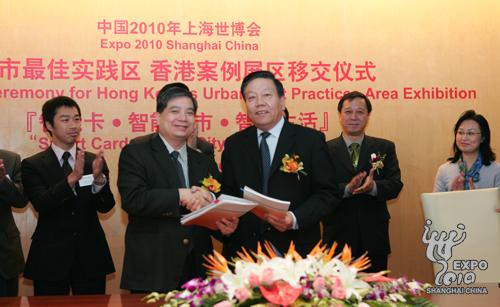 上海世博会事务协调局局长特别助理张蕴杰(右)与香港商务及经济发展局副秘书长萧如彬代表双方签署展区移交备忘录