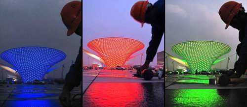 灯火璀璨的世博轴前工人正在加紧施工