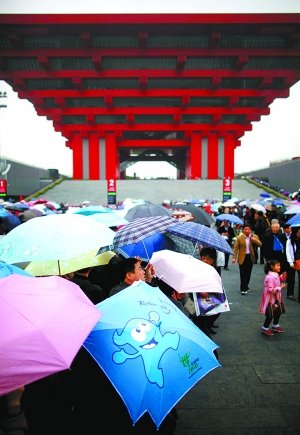 4月20日,游客雨中撑伞等待进入中国馆参观。本报记者 王申 摄