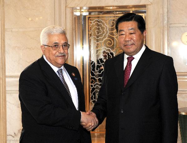 5月1日,中共中央政治局常委、全国政协主席贾庆林在上海会见前来出席上海世博会开幕式的巴勒斯坦国总统、民族权力机构主席阿巴斯。新华社记者李学仁摄