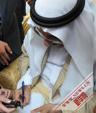 2010年5月1日,世博园正式开园,沙特阿拉伯王子曼苏尔 本 穆泰 本 阿布扎勒 阿齐兹为沙特馆开馆仪式剪彩,并接受新华网专访。图为曼苏尔王子为海内外新华网友留言