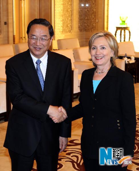 5月22日,中共中央政治局委员、上海市委书记俞正声在上海世博中心会见美国国务卿希拉里·克林顿。
