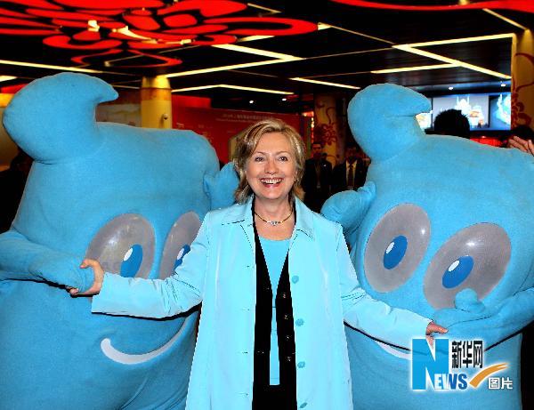 5月22日,美国国务卿希拉里·克林顿在上海世博园中国馆参观时与“海宝”亲密接触。 新华社记者张明摄