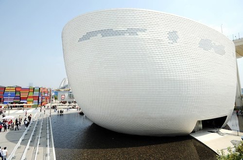 “冰壶”宛若一座水中的岛屿,外墙上覆盖着25000片环保材料制成的鳞状物。