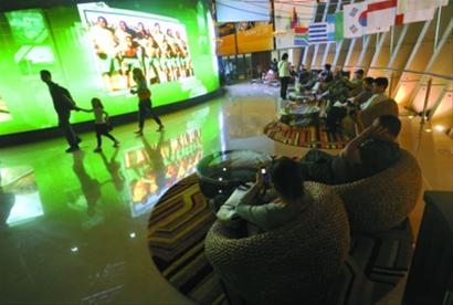在馆内,两块3D投影大屏幕已经就位,让游客可以看到身临其境的3D世界杯直播,其信号来自南非的电视台。今晚,这块屏幕会高清直播开幕式和首场比赛。而在“球吧”门口,便是世界杯倒计时碑,一分一秒地计算着距离世界杯到来还有多少时间。