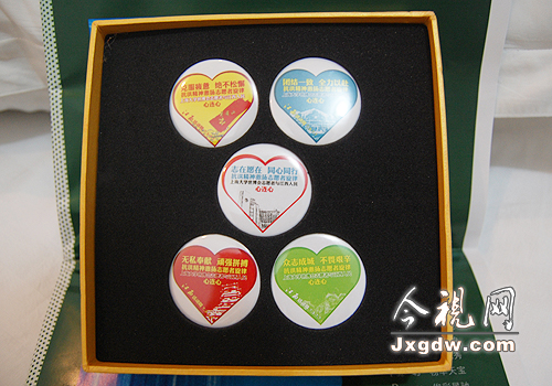 为了更好的配合江西活动周的开展,同时以抗洪精神更好的激励志愿者做好世博服务,上海大学志愿者们亲手设计了一套“同心”章,分别以江西井冈山、瑞金、滕王阁、三清山、上海大学图书馆为象征,发放给出席活动周开幕式的抗洪抢险英雄代表和嘉宾及游客。