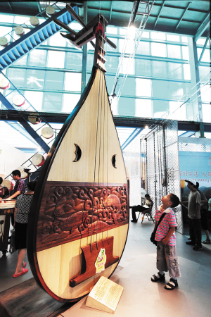 在宝钢大舞台二楼的展厅一角,有一只高4.5米的巨型琵琶。这件由上海民族乐器一厂制作的宝贝是唐螺钿枫琵琶的放大版,重达900公斤。(纪海鹰)