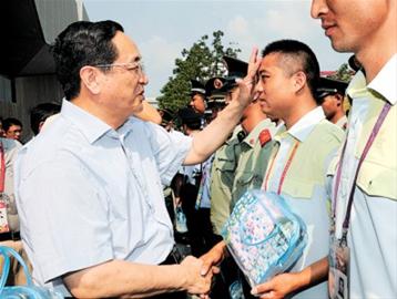 烈日下,俞正声为世博园区服务保障人员拭去额头的汗水。记者 周寅杰 摄