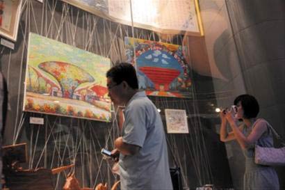 游客正在观赏陈锦芳的世博画 周斌 现场图片