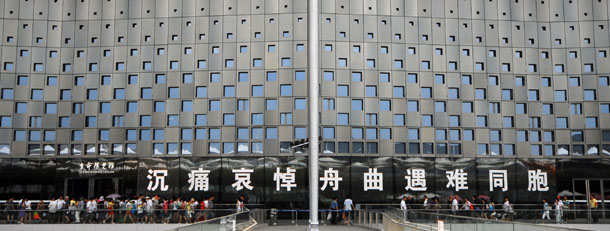 8月15日,上海世博会主题馆打出哀悼舟曲遇难同胞的标语。新华社发