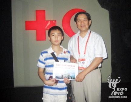 17日下午,上海世博园区突降雷暴雨,但疾风暴雨挡不住人们的观博热情。在雷雨声中,国际红十字与红新月馆迎来了第60万名参观者。这名幸运游客是来自广州市华侨外国语学校的12岁少年涂远哲。小远哲高兴地戴上红十字帽子,换上红十字馆T恤衫,俨然成为一名小小的红十字志愿者。随后,涂远哲和妈妈一起参观了红十字馆。