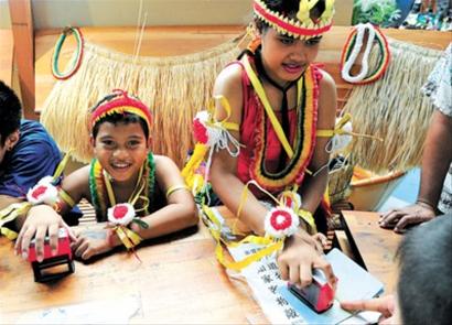 在密克罗尼西亚联邦馆内,当地的孩子们身着传统服饰为游客敲章。