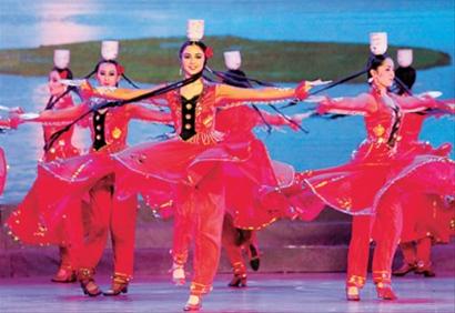 维吾尔族演员献上颇具特色的集体舞《顶碗舞》。 本报记者 邵剑平 摄