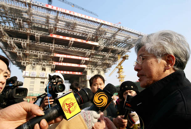 2008年12月31日,中国馆钢结构封顶。中国馆设计团队主持人何镜堂在现场介绍中国馆设计理念。新华社记者 任珑 摄