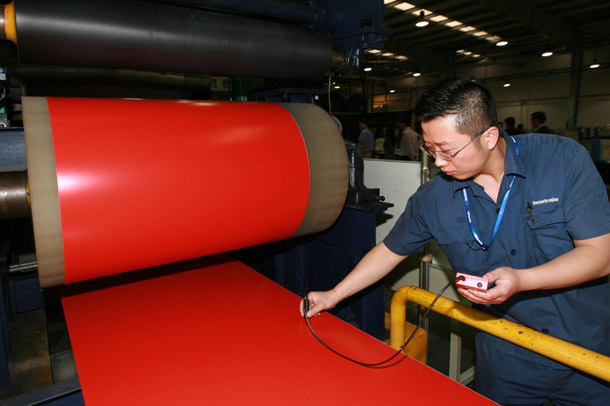 2009年5月15日,中国馆墙体板生产线启动,生产出第一卷“中国红”铝板。新华社记者 任珑 摄