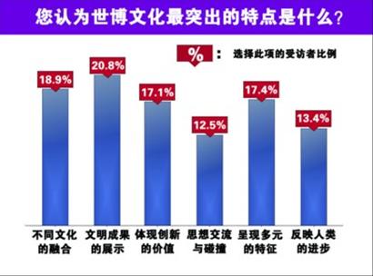 本次调查中,20.8%的受访者认为,上海世博会的文化特点是人类文明成果的集中展示;其次是不同区域、种族文化的融合;而呈现在参观者面前的,确确实实是文化的多元化特征。