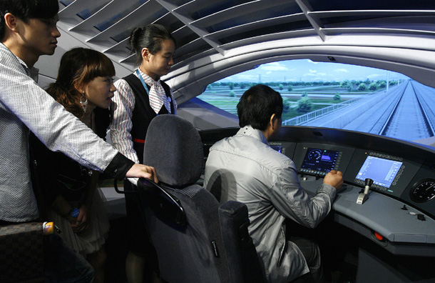 10月2日,游客在世博园中国铁路馆亲身体验“操作国产高速动车组”。新华社记者 陈飞 摄