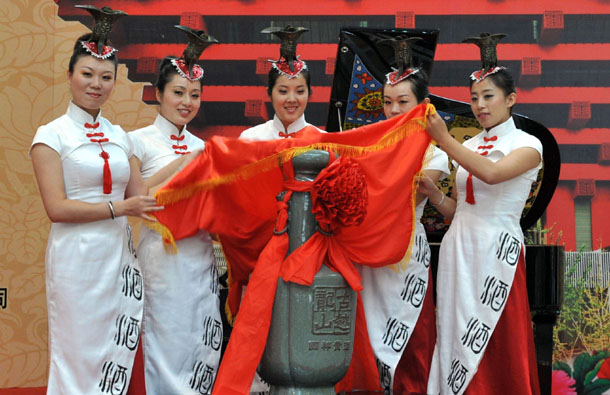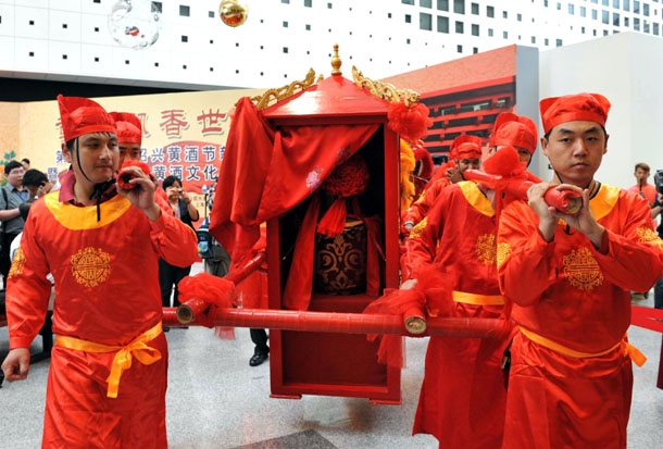 在昨天的活动现场,绍兴方面举行了隆重的赠酒仪式。一坛为世博量身定做的“古越龙山世博永久珍藏酒”由花轿抬着进入中国馆,并珍藏于世博中国馆。这坛“世博永久珍藏酒”高1.1米,酒坛为龙泉哥窖青瓷,酒是从古越龙山中央酒库精选的古法酿造的手工原酿酒30公斤。